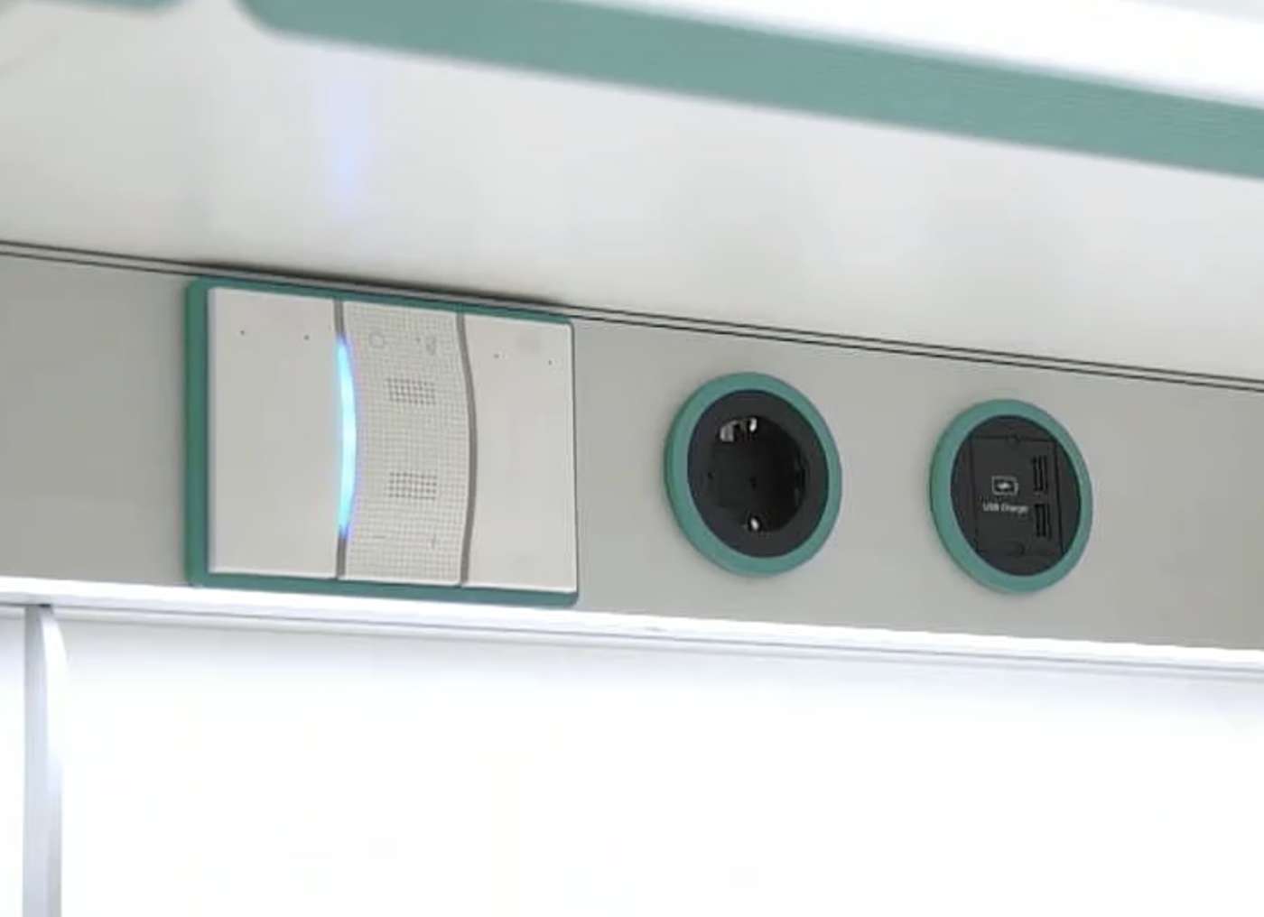 Il progetto di Fabio Novembre riguarda anche il living, il cui design si integra con la cucina rispettando modularità e forme, e il bagno, che diventa un ambiente sempre connesso. Come negli ambienti cucina e living anche qui il dispositivo altoparlante è integrato alla task bar, a cui è possibile applicare accessori tipici dell’ambiente.