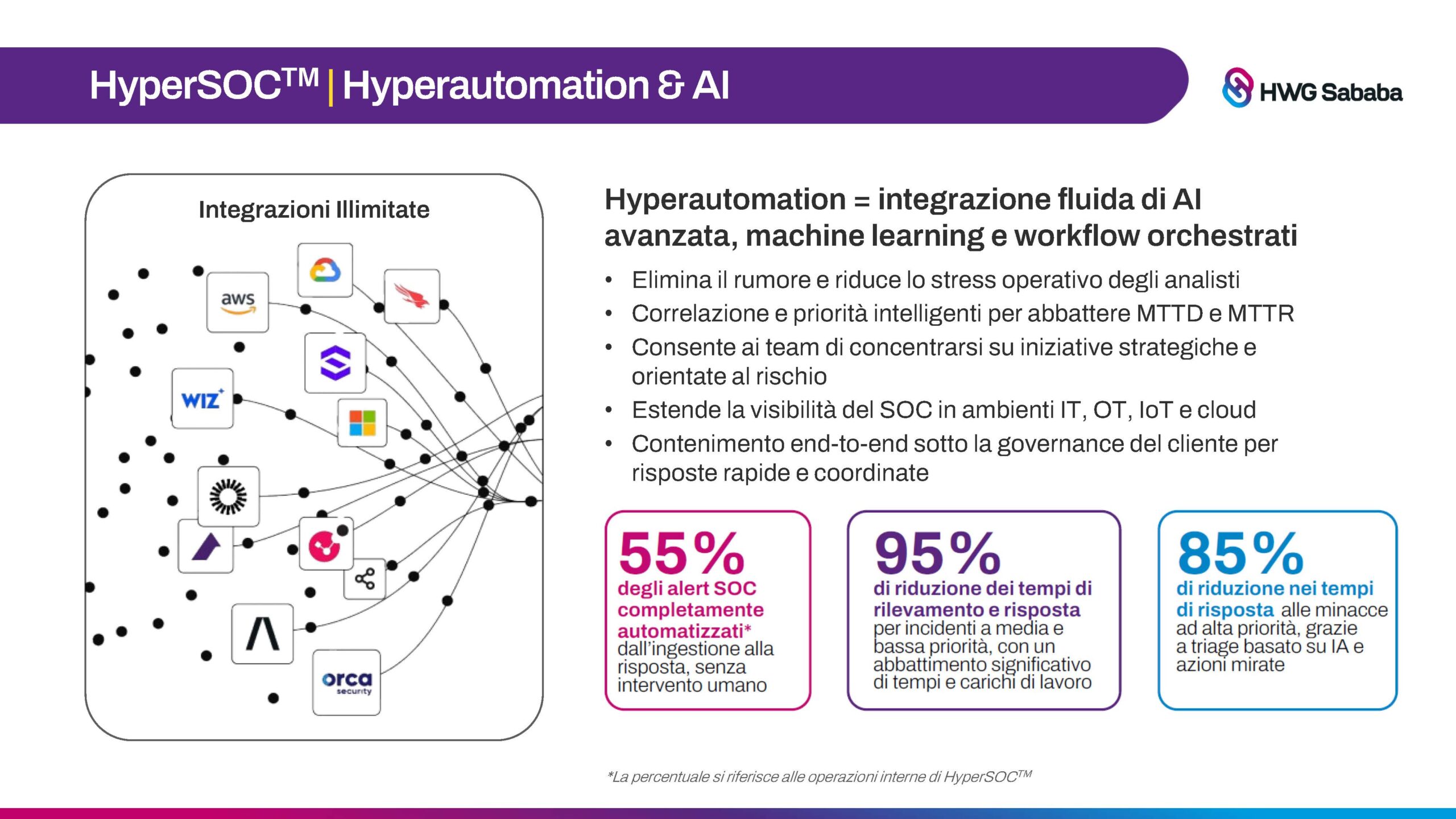 Per fare un esempio concreto, in HWG Sababa l’adozione dell’AI, in particolare dei meccanismi di hyperautomation, ha portato a una significativa ottimizzazione della gestione degli alert, con l’automazione di circa il 55% del volume mensile di alert. Questo permette agli analisti di concentrarsi sui casi a maggior valore, aumentando la capacità operativa del SOC. Significativi anche i miglioramenti dal punto di vista della performance, con una riduzione del 95% dei tempi di MTTI (Mean Time to Detect) e MTTR (Mean Time to Respond) per i casi a media e bassa priorità, e di circa l’85% per i casi ad alta priorità.