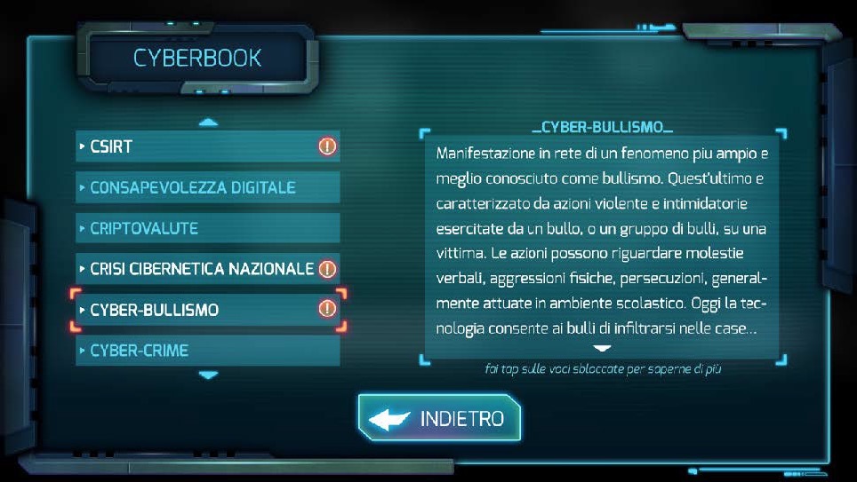 A tal fine, all’interno del gioco si trova un Cyberbook, un glossario per familiarizzare con i principali termini utilizzati nel mondo della cybersecurity. Il Cyberbook è disponibile anche singolarmente, a questo link diretto (PDF 1,1 MB).