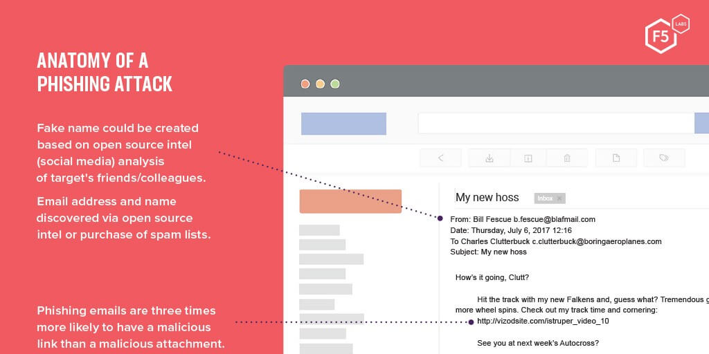 Secondo gli F5 Labs, gli indirizzi a cui inviare le email di phishing provengono da una varietà smisurata di fonti, come liste spam e dall’intelligence open source. Le mail di phishing possono essere inviate a migliaia di potenziali vittime o a un individuo specifico, a seconda dell’approccio e dell’intensità con cui vengono colpite le vittime.