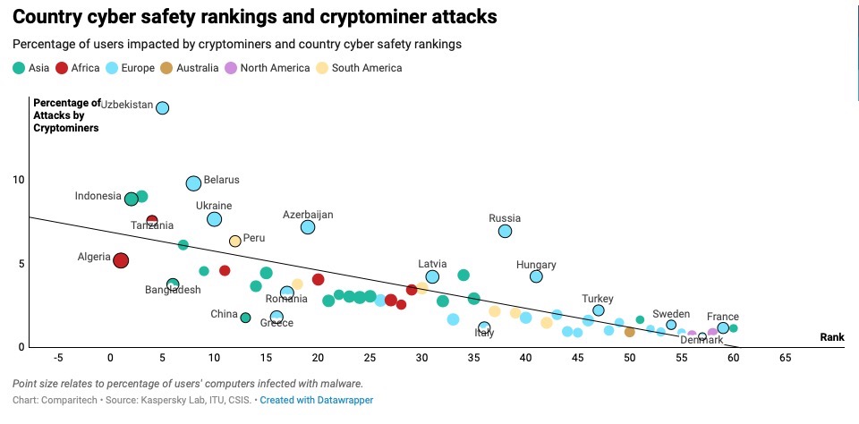 La percentuale più bassa di attacchi da parte di cryptominer è in Danimarca: 0,61% degli utenti. Il Paese meglio preparato per gli attacchi informatici è Singapore, con un punteggio di 0,925.