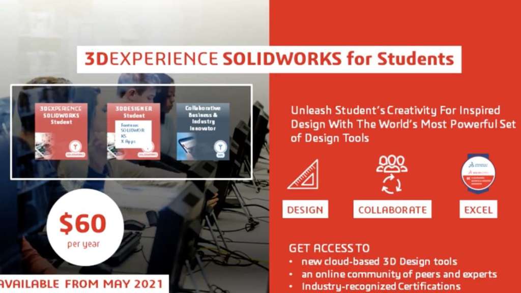 3DExperience Solidworks for Students è una soluzione che comprende Solidworks Professional, 3D Creator e 3D Sculptor a 60 dollari all’anno e sarà disponibile da maggio 2021 dando accesso ai tool di design 3D su cloud.