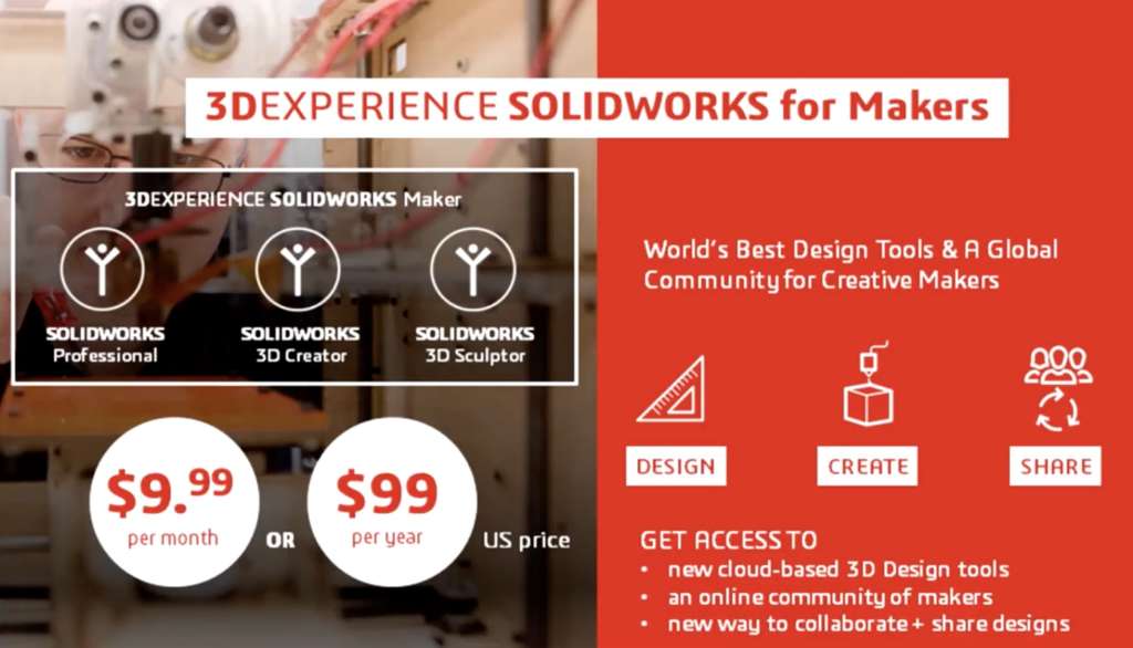 Anche 3DExperience Solidworks for Makers, include Solidworks Professional, 3D Creator e 3D Sculptor, e la soluzione per i creatori professionali sarà disponibile a 99 dollari all’anno o a 9,99 dollari al mese.