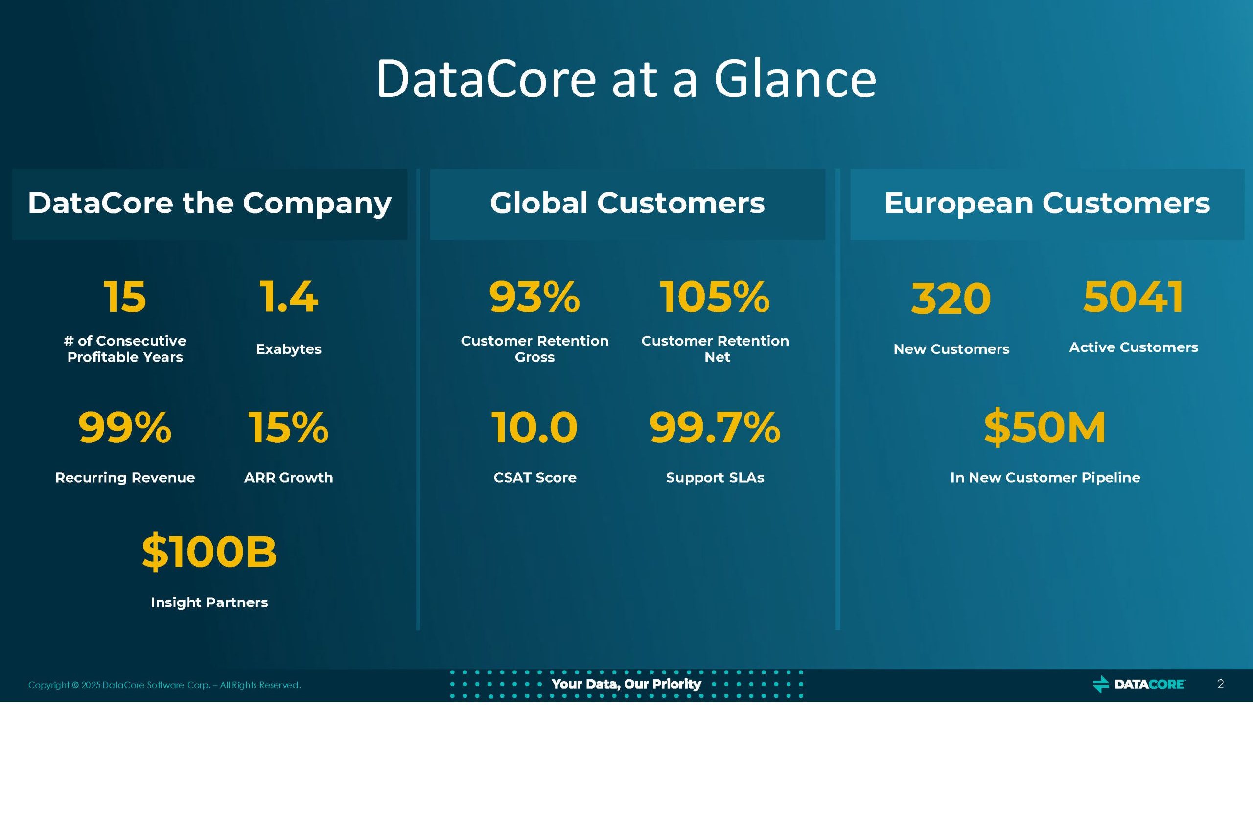 I dati finanziari e operativi di DataCore riflettono un modello di business orientato alla stabilità e al valore di lungo periodo. L’azienda può vantare 15 anni consecutivi di profittabilità, un elemento raro nel settore dell’IT enterprise, spesso soggetto a cicli altalenanti. Il 99% del fatturato deriva da contratti ricorrenti (subscription o supporto), segno di un forte legame con la base clienti, che raggiunge un tasso di retention netta del 105%. Questa fidelizzazione è frutto di un’offerta modulare e aperta, che consente ai clienti di evolvere l’infrastruttura senza vincoli di vendor lock-in. Con oltre 5.000 clienti attivi in Europa e 320 nuovi contratti firmati nel 2024, DataCore si afferma come una delle realtà più solide e in espansione nel settore dello storage software-defined.
