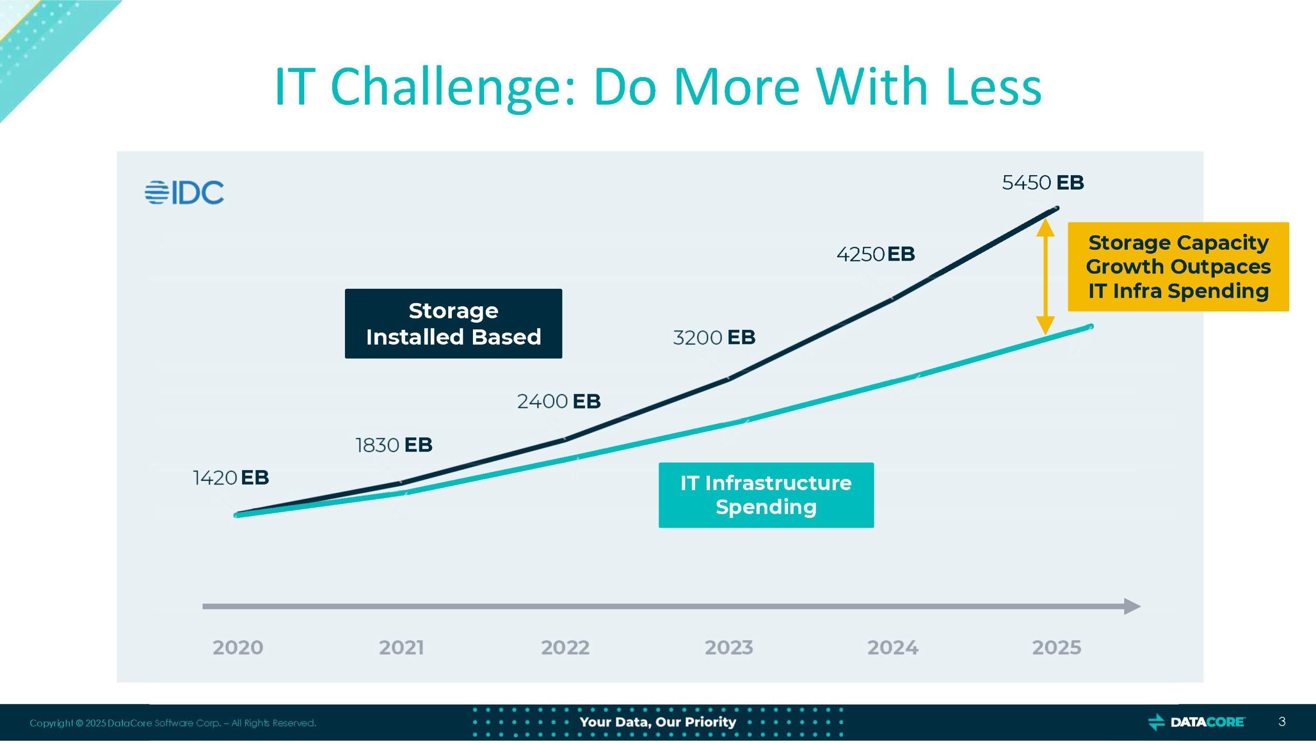 Il divario tra il volume di dati da archiviare e le risorse allocate per gestirli sta diventando strutturale. Come mostrato dal grafico IDC riportato nella presentazione, tra il 2020 e il 2025 il fabbisogno di capacità storage è cresciuto da 1.420 a oltre 5.400 exabyte, con una crescita media annua superiore al 25%. Al contrario, gli investimenti in infrastrutture IT crescono molto più lentamente, a tassi prossimi al 10%. Questa forbice impone nuove strategie: ottimizzare l’utilizzo delle risorse esistenti, evitare l’overprovisioning e implementare soluzioni intelligenti di gestione automatizzata. DataCore si inserisce in questo contesto con una proposta basata su software che consente di astrarre l’hardware sottostante, liberando valore da asset già presenti nei datacenter delle imprese.