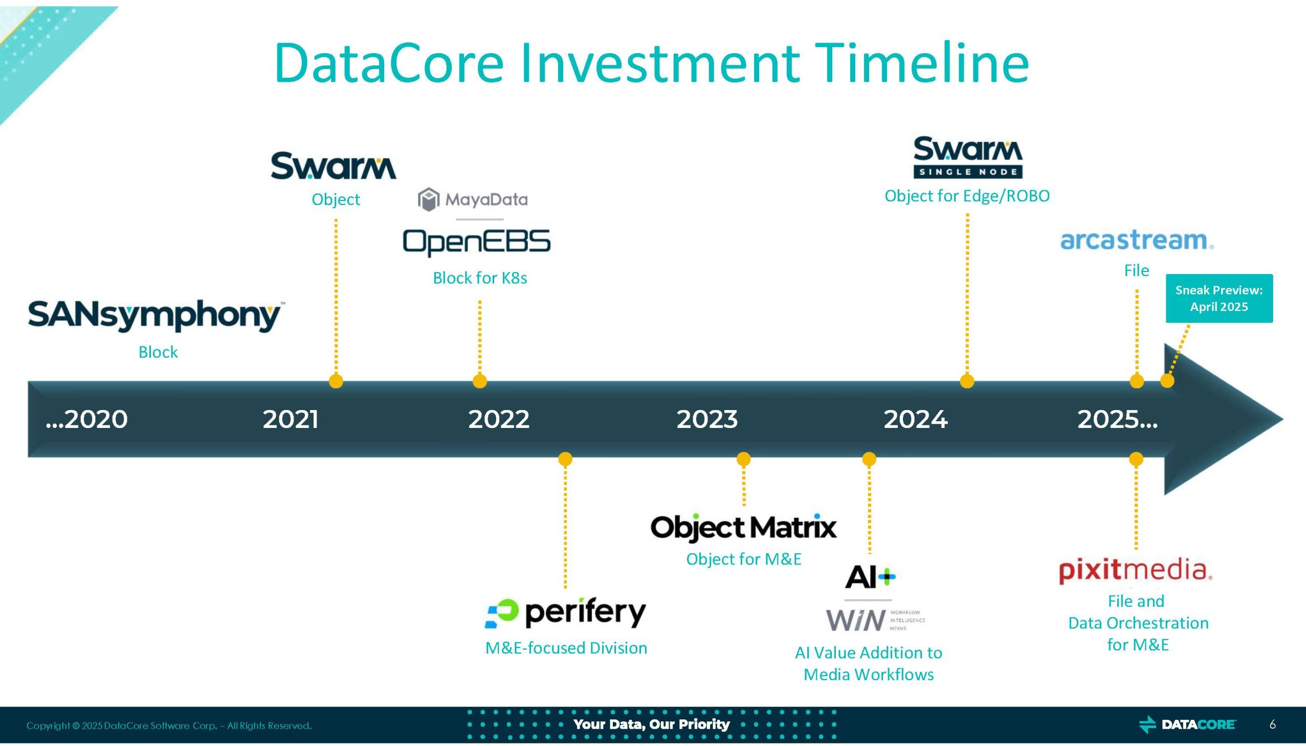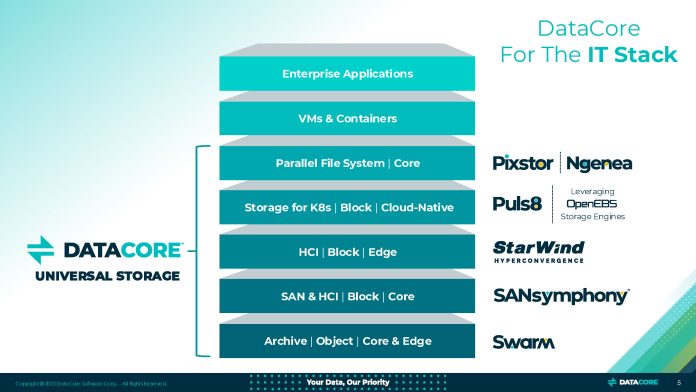 Negli ultimi cinque anni, DataCore ha costruito un portafoglio estremamente articolato attraverso un’intensa attività di acquisizioni mirate. L’operazione Object Matrix ha rafforzato la proposta per il mercato M&E, consentendo di gestire asset digitali in modo granulare e conforme agli standard broadcast. Con Swarm Single Node, l’azienda ha portato le funzionalità di object storage anche in ambienti periferici e ROBO. L’acquisizione di Pixitmedia e Arcastream ha integrato funzionalità avanzate di file storage ad alte prestazioni, cruciali per il rendering, la post-produzione e i flussi creativi in tempo reale. L’investimento in OpenEBS (progetto CNCF) ha permesso a DataCore di presidiare l’ambito Kubernetes-native. Infine, l’ingresso di StarWind ha ampliato l’offerta block e HCI nei segmenti SMB ed edge, rafforzando la leadership nella virtualizzazione storage-driven.