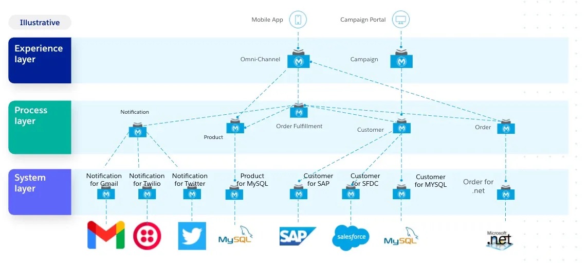 L’architettura di MuleSoft si fonda su un modello a tre layer che separa in modo chiaro i compiti tecnici, logici e di presentazione dei dati. Questo approccio consente riutilizzabilità, scalabilità e governance su larga scala, ed è uno dei principali elementi differenzianti della piattaforma.
