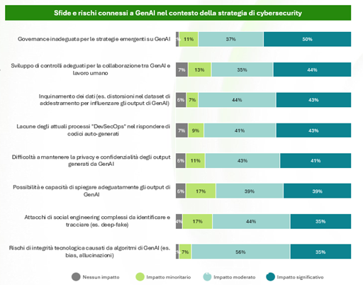 Secondo quanto emerso dalla ricerca di Deloitte, tra i rischi più impattanti generati da GenAI identificati dalle imprese intervistate spiccano una governance inadeguata delle iniziative GenAI (50%), la necessità di sviluppare controlli efficaci sulle interazioni tra umani e sistemi GenAI (44%), e il possibile inquinamento degli output a causa della manipolazione delle banche dati usate per l’addestramento degli algoritmi (43%).