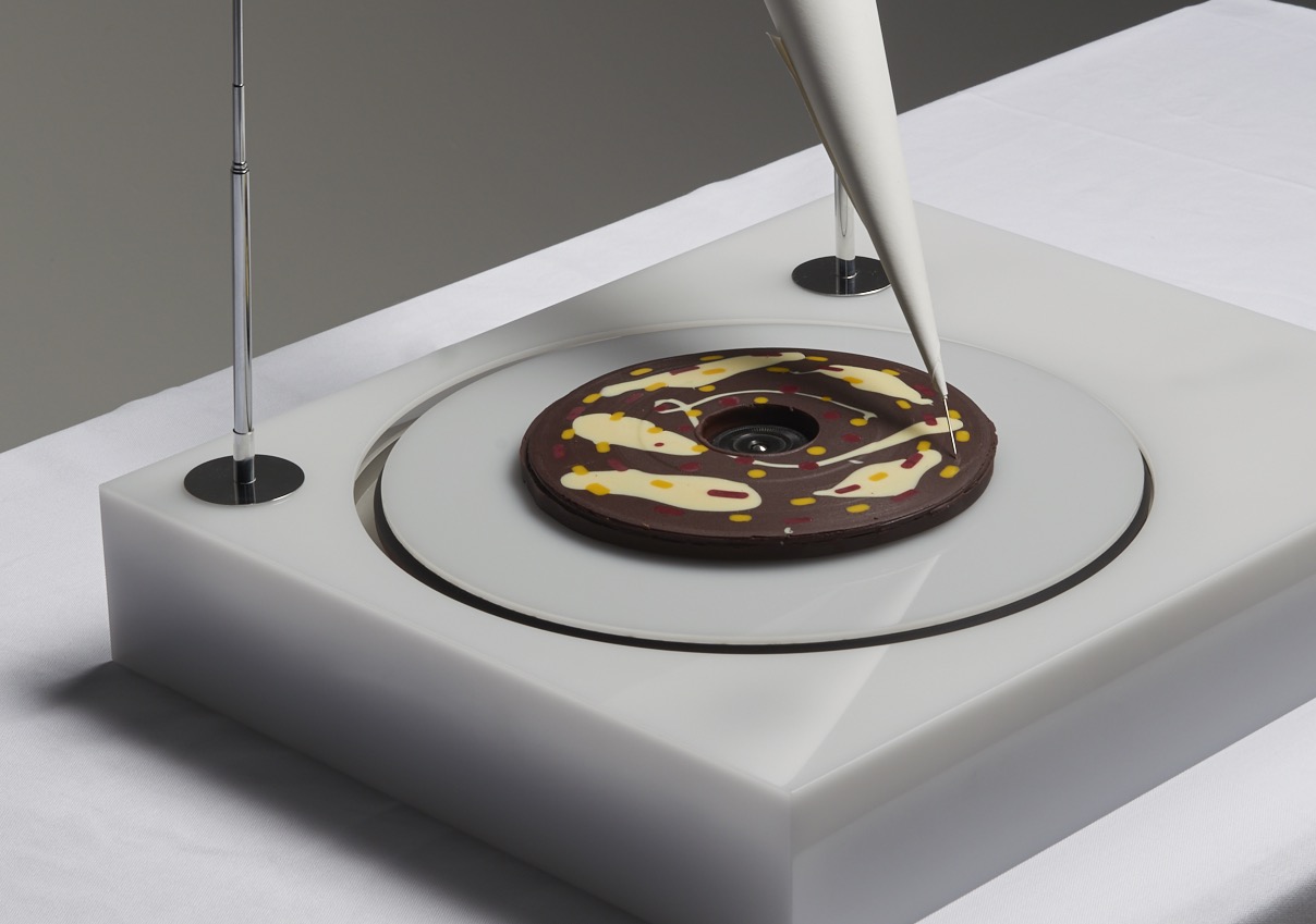 Il progetto, denominato Déguster l’augmenté, consiste in un dolce a base di gelatina in movimento, un lecca lecca che rifrange la luce e un disco di cioccolato.