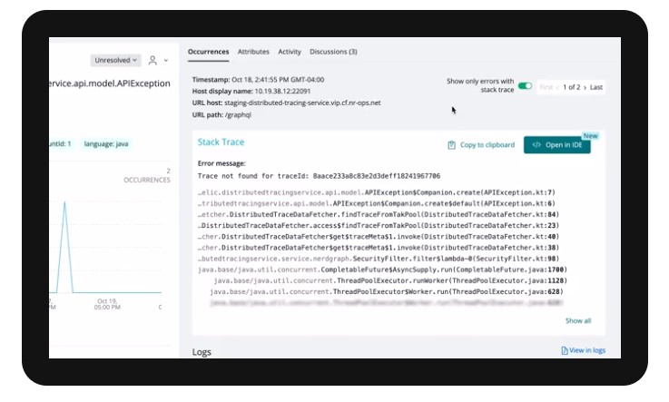 Possono poi passare da New Relic One al proprio IDE con un solo clic per navigare, valutare e agire sugli errori di produzione nel contesto dello specifico repository e delle linee di codice.