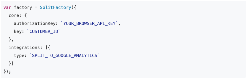 L’invio di dati a Google Analytics richiede l’utilizzo dell’SDK JavaScript di Split, che offre una serie di funzioni per inviare dati dal client a Google Analytics in un payload parallelo a quello che Google Analytics sta già raccogliendo.