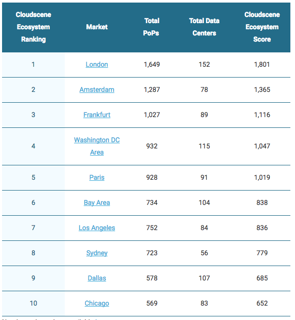 La top ten di Cloudscene vede in testa tre città europee, a testimonianza soprattutto del grado di dinamismo e di interconnettività dei provider del Vecchio Continente. Sul podio troviamo infatti – nell’ordine – Londra, Amsterdam e Francoforte.