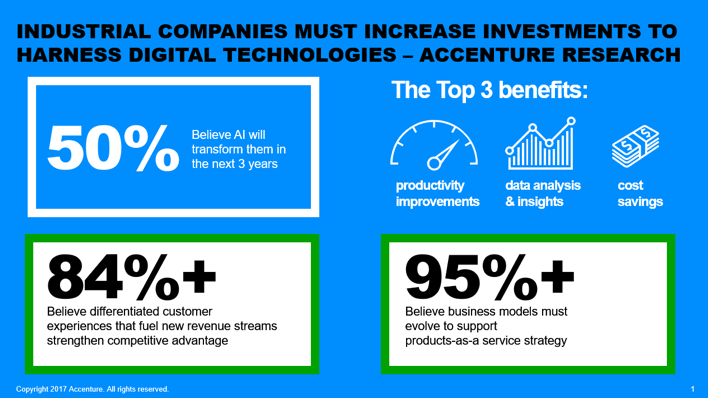 Nell’ambito dello studio Technology Vision di Accenture 2017, Accenture ha intervistato in tutto il mondo 102 executive del mercato automotive e 562 del settore Industrial Equipment (IE), legato alla produzione di macchinari industriali.