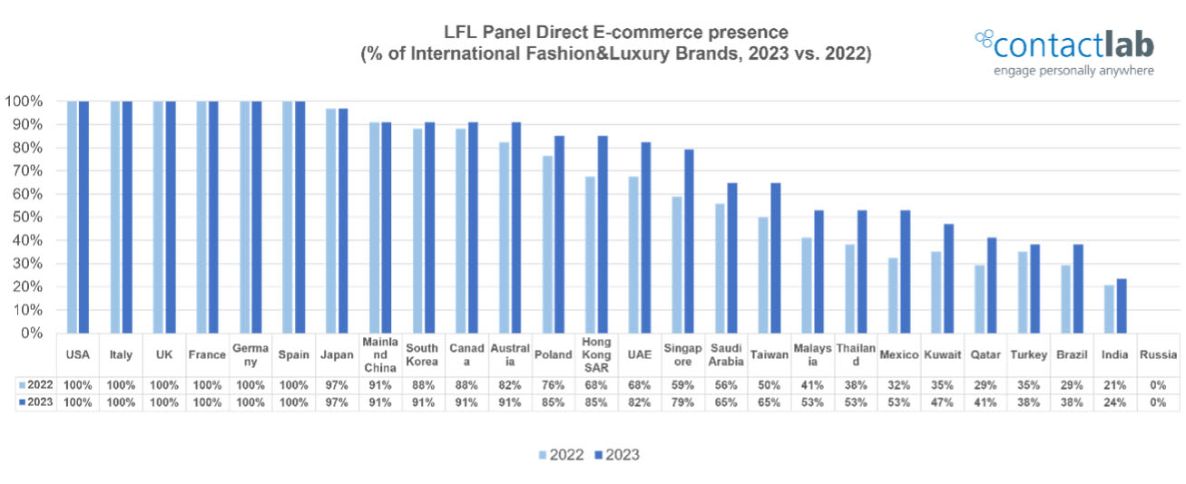 Dall’analisi emerge che, rispetto al 2022, i grandi marchi internazionali hanno scelto di investire per estendere il propri shop online soprattutto in Paesi di grande rilevanza strategica in estremo oriente come Singapore (dove un 20% in più dei brand del panel ha avviato un suo e-commerce diretto), Hong Kong (+17%), Taiwan (+15%), ma anche nei più importanti centri del medio-oriente come Arabia Saudita (+19%), Emirati Arabi Uniti (+14%), Qatar (+12%) e Kuwait (+12%). Il presidio online dei grandi fashion brand aumenta in maniera sensibile anche in altri continenti, specialmente in Messico (+21%) e in Australia (+9%), Brasile (+9%) e Polonia (+9%).
