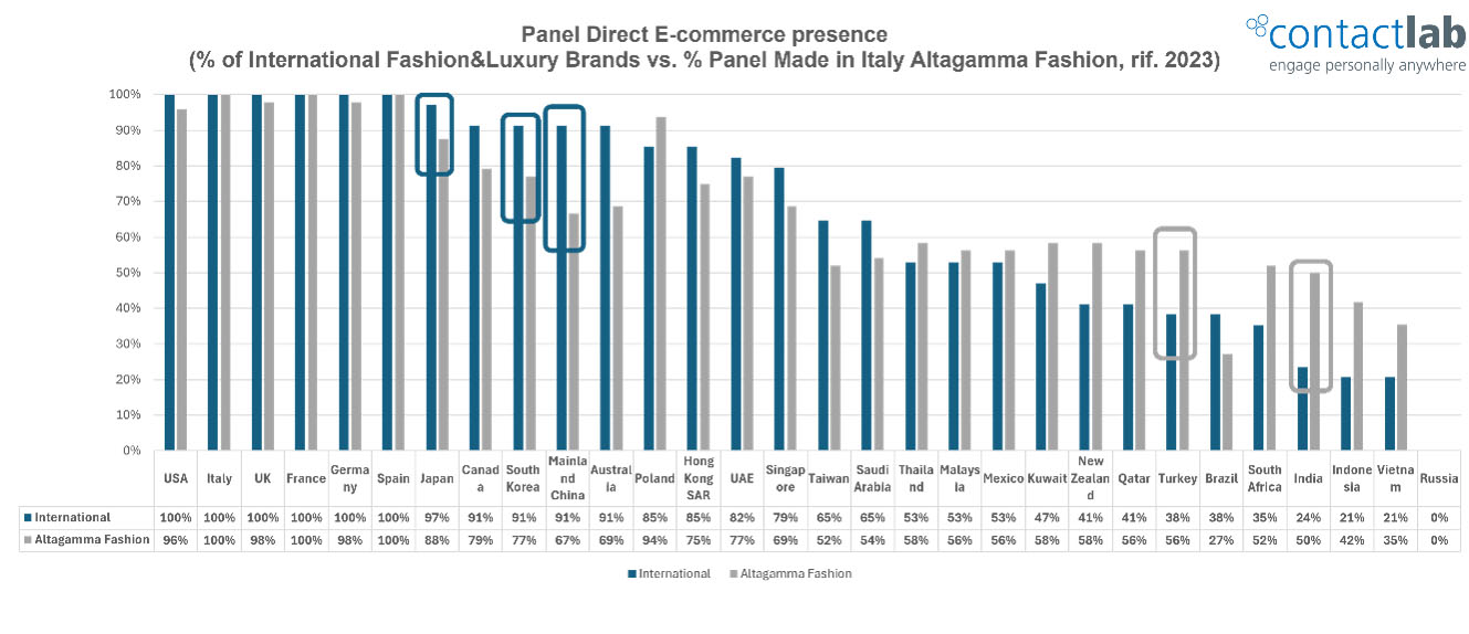 Per quanto riguarda i marchi del Made in Italy (il cui campione è costituito dai brand soci di Altagamma – fondazione che, dal 1992, riunisce imprese dell’alta industria culturale e creativa, che ha commissionato l’estensione della Digital Competitive Map ai soci dei settori Fashion & Jewelry, Design Furniture, Food & Beverage e Hospitality), questi mostrano una presenza importante – rispetto ai competitor internazionali – in Polonia (dove il 94% dei brand italiani è presente con e-commerce diretto, contro l’85% della media) e in Turchia (56% vs 38%) – complice la vicinanza geografica di questi mercati –, ma anche in Sud Africa (52% vs 35%), in Nuova Zelanda (58% vs 41%) e, con un presidio doppio rispetto alla media, in India (50% vs 24%) e in Indonesia (42% vs 21%). Il panel italiano è invece meno attivo rispetto ai competitor internazionali in Cina (67% vs 91%), in Giappone (88% vs 97%) e in Corea del Sud (77% vs 91%).
