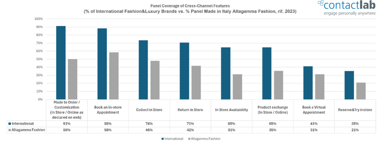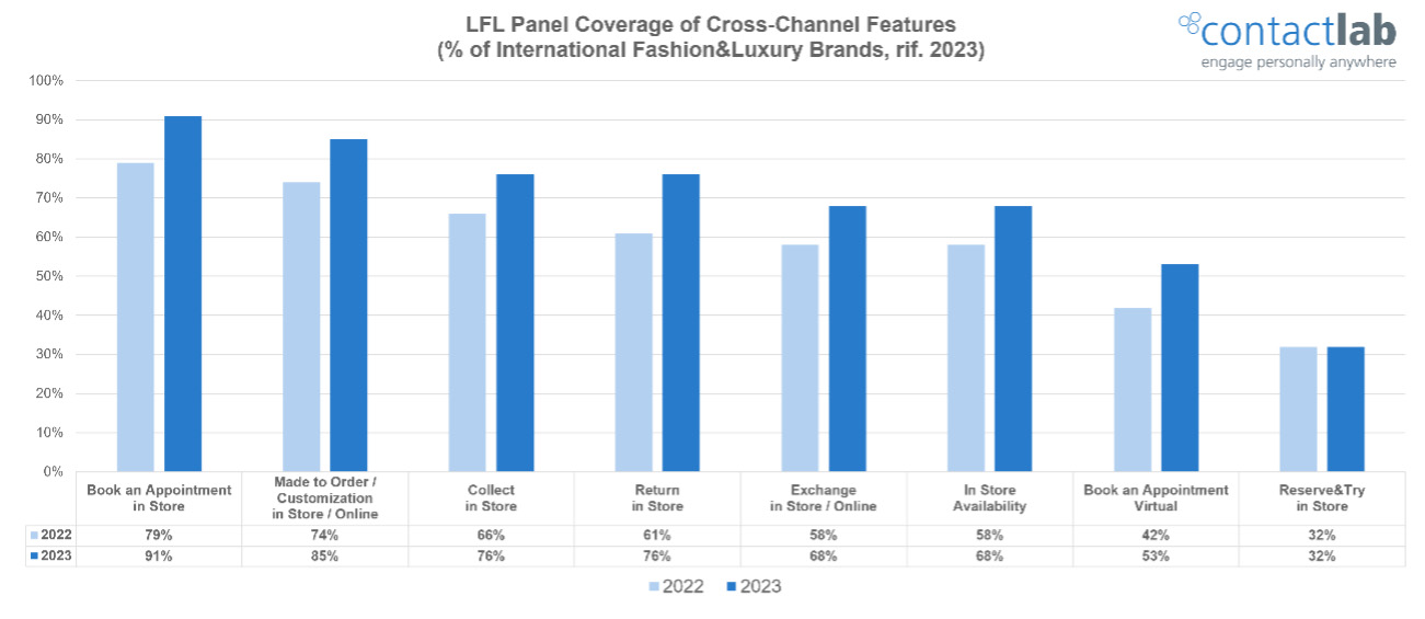 Prosegue inoltre il percorso verso il raggiungimento dell’omnicanalità, con l’aumento dei servizi cross canale offerti dai siti web dei grandi marchi del Fashion & Luxury, su cui è sempre più facile trovare la possibilità di fare o personalizzare un ordine da pagare e ritirare in store (sul 91% dei siti, contro il 79% del 2022), prenotare un appuntamento in negozio (88% vs 84%), comprare direttamente online ma con il ritiro in negozio (74% vs 68%), restituire un oggetto acquistato online in store (71% vs 47%) e molto altro ancora.