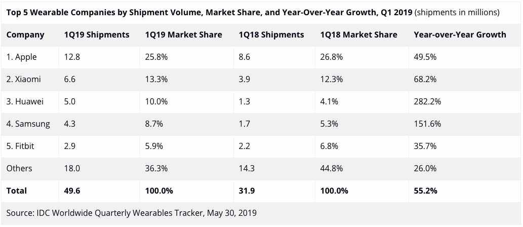 Le spedizioni globali di dispositivi indossabili hanno raggiunto 49,6 milioni di unità durante il primo trimestre del 2019 (1Q19), con una crescita del 55,2% rispetto all’anno precedente.