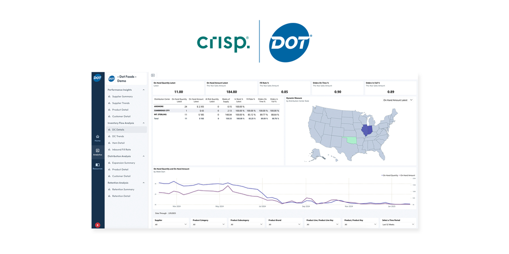 Crisp’s robust data platform powers the backend infrastructure of Crisp at Dot, ensuring suppliers have access to accurate, harmonized data across multiple retailers and distributors. This collaboration underscores Dot Foods’ leadership in driving supplier success through innovation and efficiency.