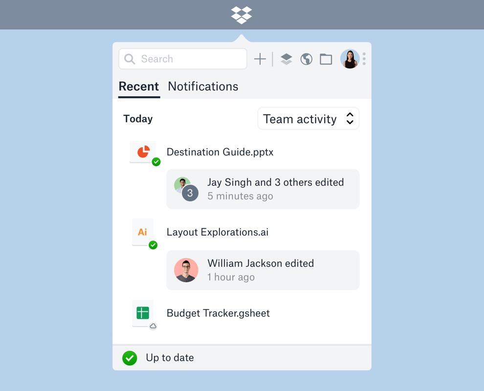 L’icona dell’app che si trova nella barra delle applicazioni di Windows e nella barra dei menu di macOS è stata anch’essa aggiornata, per consentire agli utenti di tenere traccia di ciò che accade con i contenuti condivisi, di accedere rapidamente ai lavori più importanti e di creare nuovi contenuti direttamente da Dropbox. È possibile ora accedere anche a un feed di attività del team per gli aggiornamenti sui file condivisi.