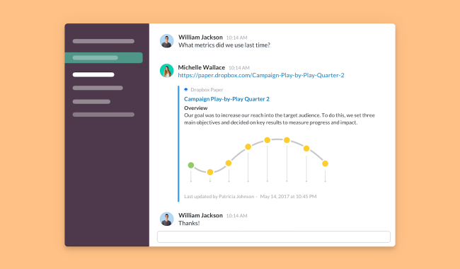 L’integrazione è tale che si può inserire in Slack un link verso un documento di Dropbox Paper per vederne un’anteprima e i metadati, creare un documento di Paper direttamente da Slack ed eseguire ricerche, sempre da una sessione di comunicazione in Slack, tra i propri documenti di Paper.