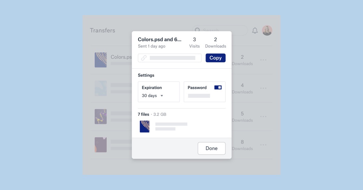 Dropbox Transfer non si limita al banale trasferimento ma offre anche qualche opzione aggiuntiva. È possibile aggiungere, modificare o rimuovere una password così come impostare e modificare una data di scadenza, anche dopo aver inviato il link.
