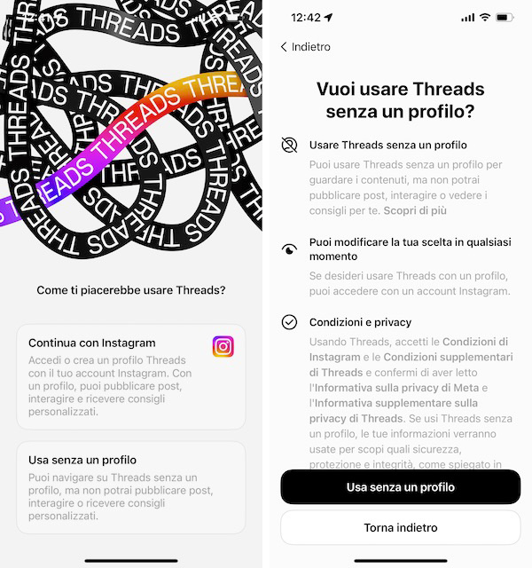 È possibile usare Threads anche senza avere un profilo, ma in questo modo è possibile solo visualizzare i contenuti pubblici della piattaforma e non si possono pubblicare post o interagire con quelli di altri utenti. In questo caso, dunque, non è un’esperienza interattiva né personalizzata, ma può essere utile per avere un primo contatto con questa nuova app e piattaforma di Meta.