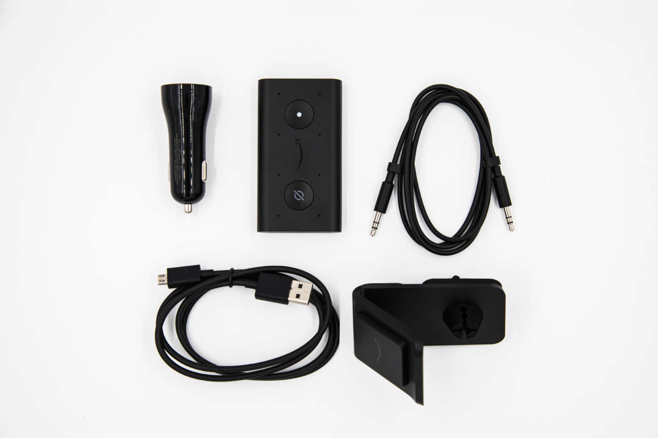La confezione di Echo Auto include supporto, cavetto Usb, cavo audio analogico con jack da 3,5 mm e adattatore per accendisigari.