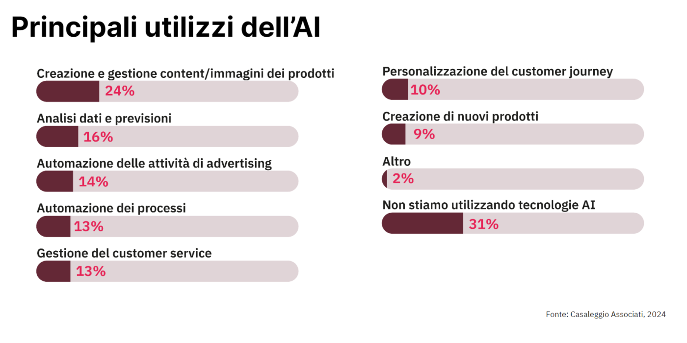Le aziende che hanno integrato l’AI nei propri processi l’hanno adottata per la creazione di contenuti e immagini (per il 24% degli intervistati), per l’analisi dati e i forecast (16%), l’automazione di attività advertising (14%) e di altri processi (13%). Per il 13% l’AI viene già utilizzata per la gestione del customer care e per il 10% per la personalizzazione del customer journey (10%). Infine, il 9% degli intervistati la utilizza anche per progettazione di nuovi prodotti.