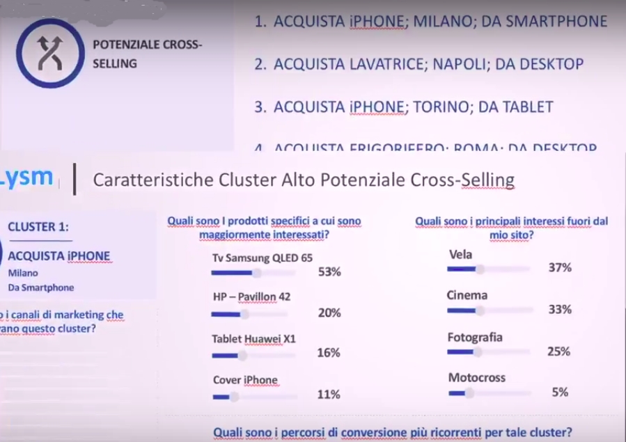 In questo caso si potrà personalizzare la navigazione di quei profili, e solo di quelli, evidenziando le schede prodotto di un nuovo Tv o di un cofanetto di film in edizione limitata. Nelle campagne di digital marketing, invece, si potrà fare leva sui contenuti “collaterali” per cui il cluster ha mostrato interesse.