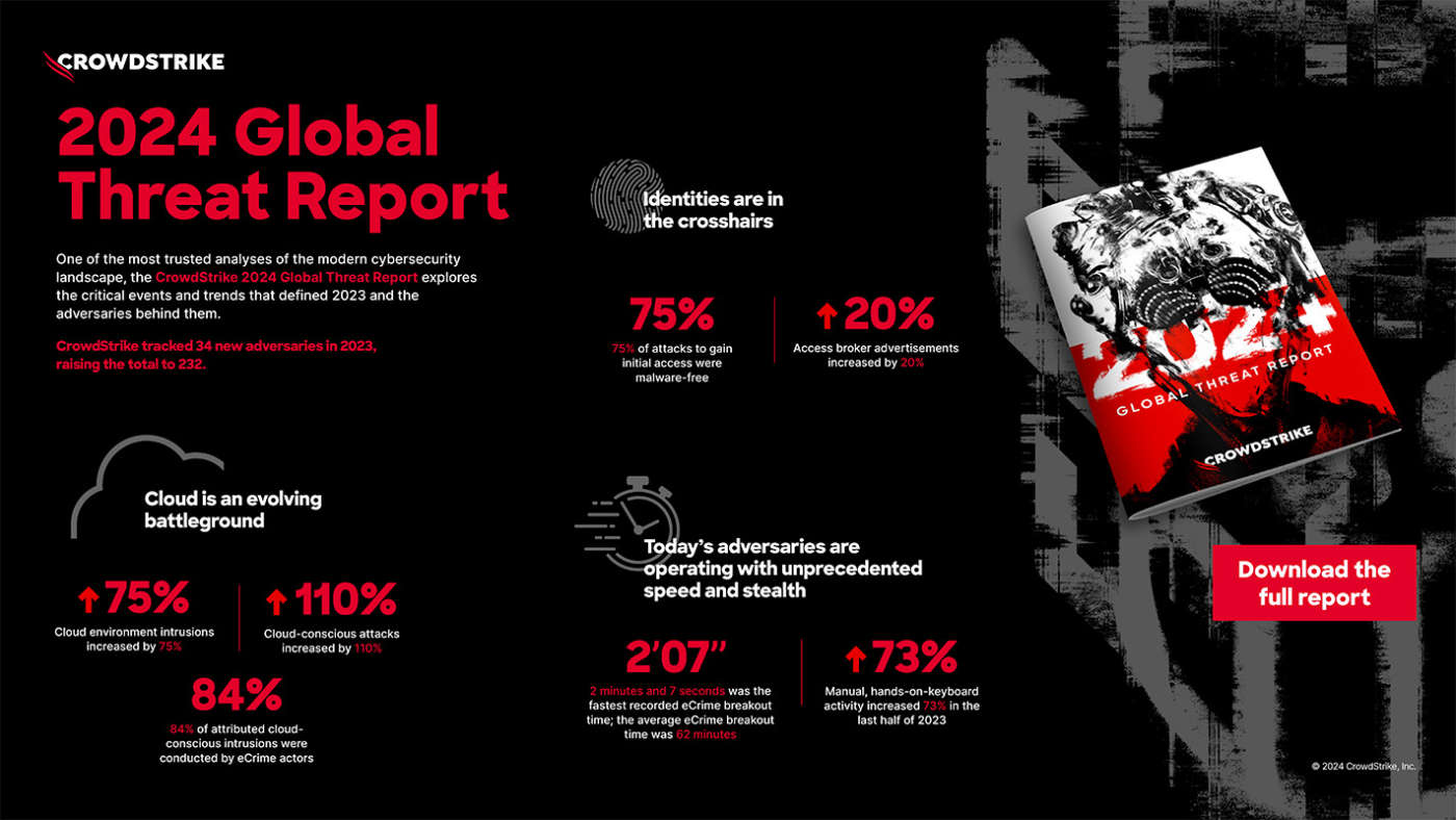 CrowdStrike ha annunciato i dati emersi dal “CrowdStrike Global Threat Report 2024”, che evidenziano un aumento degli avversari specializzati nell’utilizzo di credenziali e identità rubate per approfittare delle lacune negli ambienti cloud e massimizzare le azioni furtive, la velocità e l’impatto dei cyber attacchi.