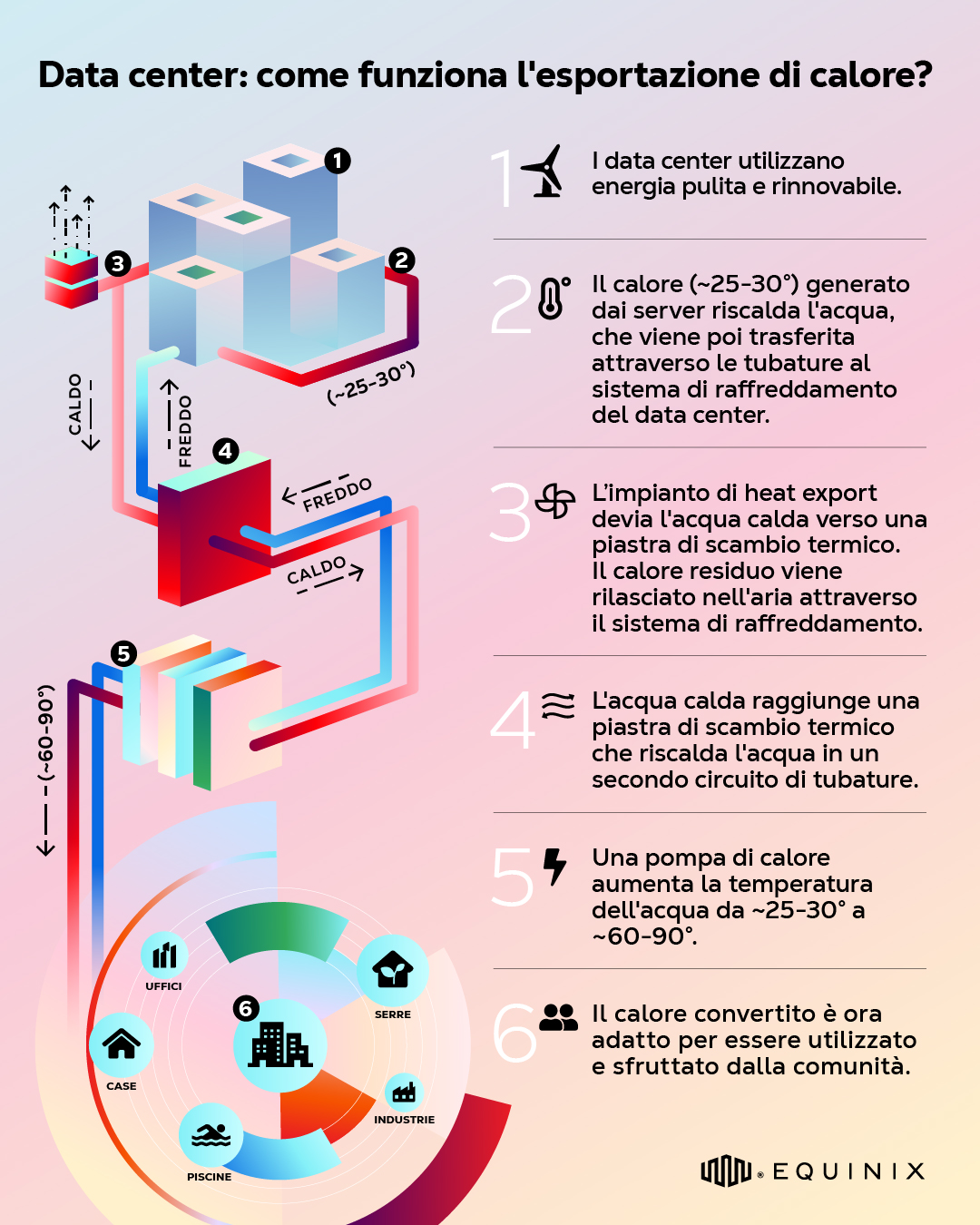 In conclusione, il programma di esportazione di calore di Equinix sostiene le comunità nella transizione verso fonti di calore alternative e a basse emissioni di carbonio per ridurre la dipendenza dai combustibili fossili e l’impronta ambientale. Allo stesso tempo, migliora la nostra efficienza operativa, poiché il processo di esportazione del calore riduce la quantità di energia necessaria per il raffreddamento; inoltre, in questo modo aiutiamo anche i nostri clienti a soddisfare i loro requisiti di rendicontazione ambientale.