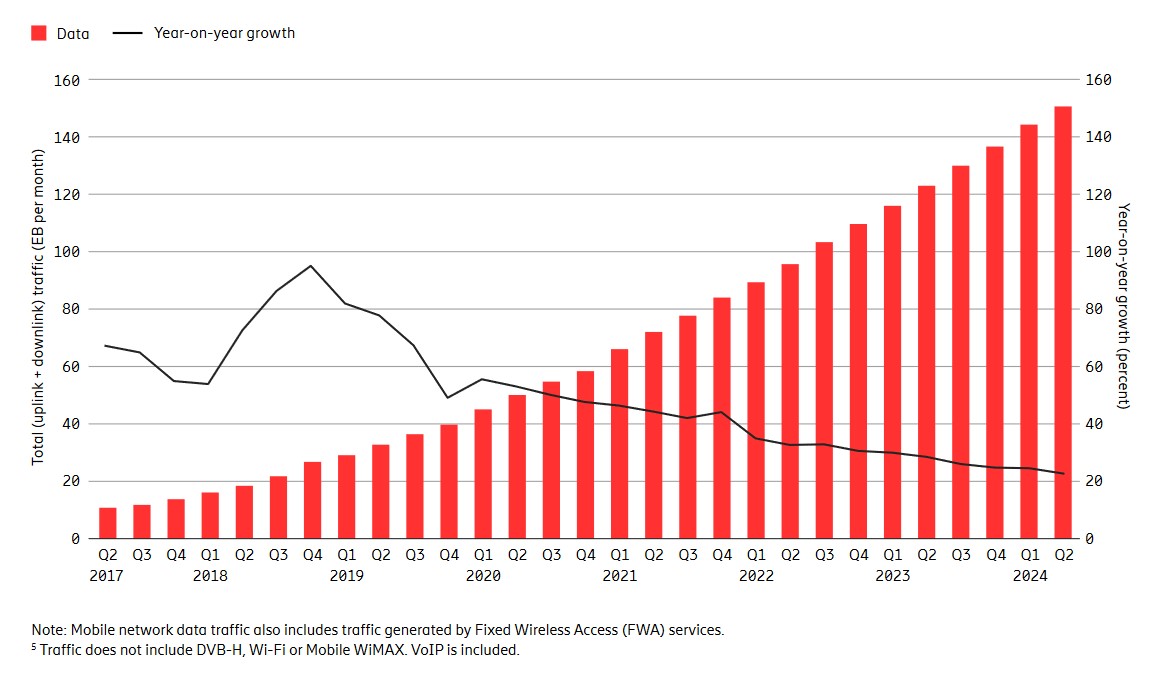 Non stupirà quindi scoprire aumenti a doppia cifra anche nel traffico dati da mobile, che è cresciuto del 23% tra il secondo trimestre 2023 e lo stesso periodo del 2024, per raggiungere i 151 Exabyte (EB) al mese, sottolinea Ericsson. Il traffico dati sulle reti mobili è raddoppiato in soli due anni.