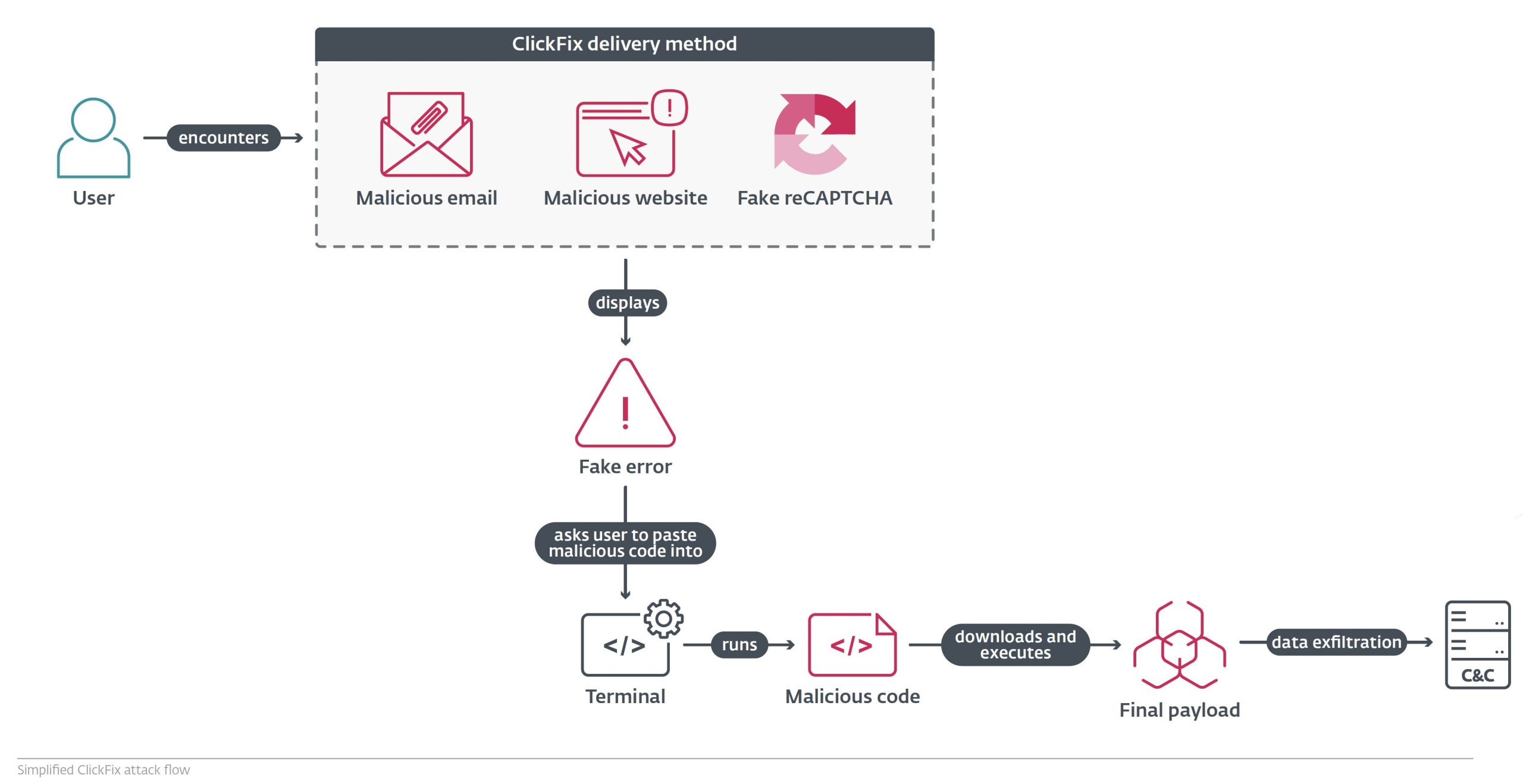 Il report individua ClickFix come la novità assoluta del semestre. In sostanza, questa tecnica sfrutta la crescente abitudine degli utenti a interagire con CAPTCHA, popup e procedure “fai da te” per la risoluzione di errori. Gli aggressori creano pagine che simulano errori di Word o OneDrive, proponendo un pulsante “Fix it” che in realtà copia nel clipboard un comando PowerShell, inducendo la vittima a incollarlo ed eseguirlo.