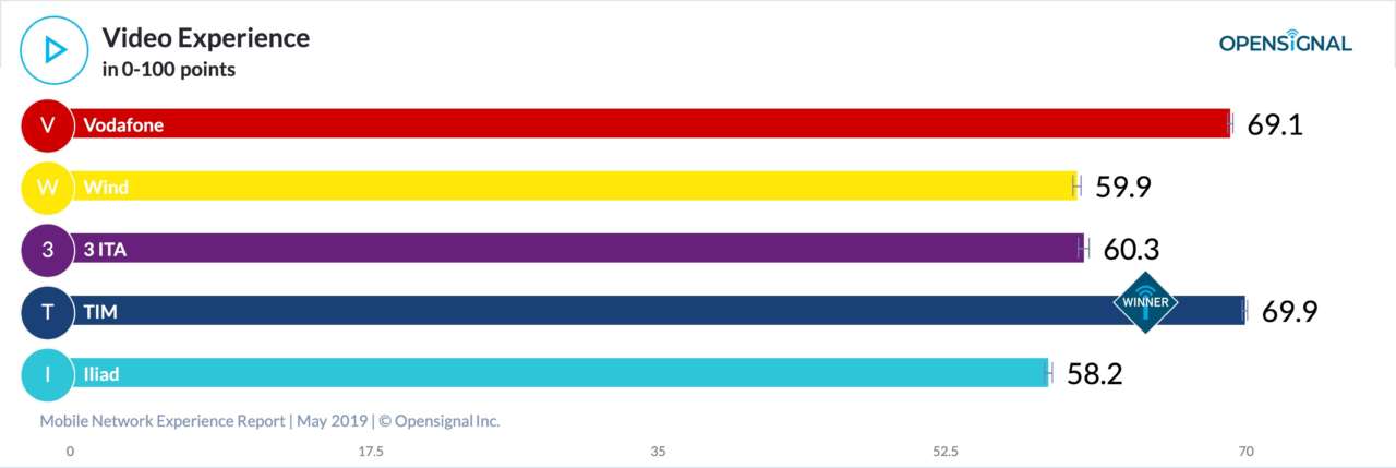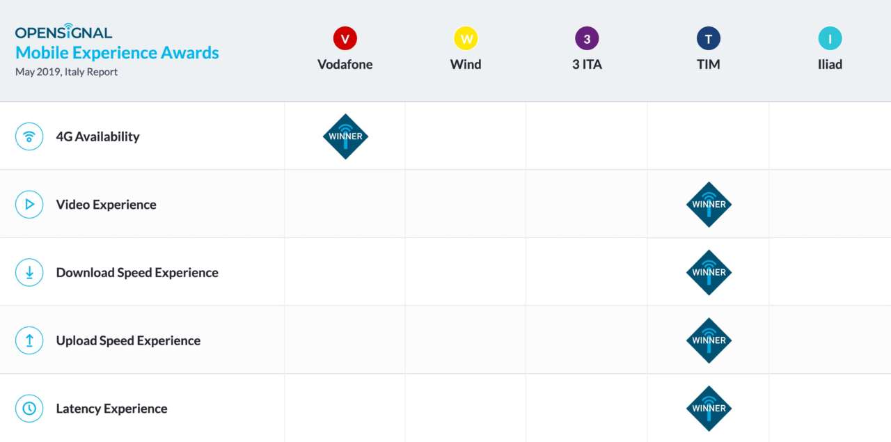 Secondo il Mobile Network Experience Report May 2019 di Opensignal, Tim offre complessivamente la migliore esperienza mobile, seguita da Vodafone. Tra le cinque categorie di valutazione, Tim si è posizionata al primo posto in ben quattro di esse. L’unico altro operatore a essere premiato come “winner” in una delle prove è Vodafone.