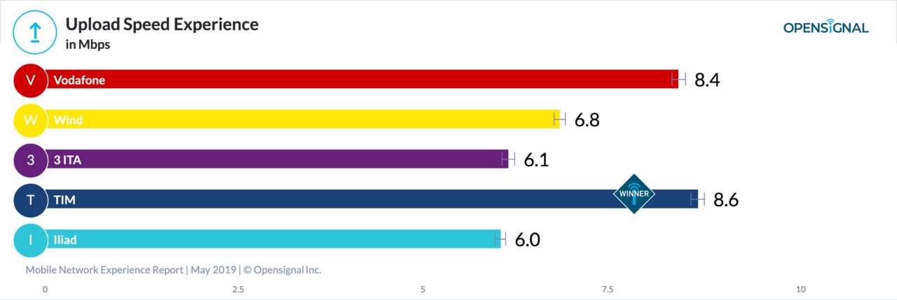 Tim ha vinto anche nella Upload Speed Experience con uno score di 8,6 Mbps, battendo di poco gli 8,4 Mbps di Vodafone. Gli altri tre operatori italiani sono rimasti più indietro in questa metrica.