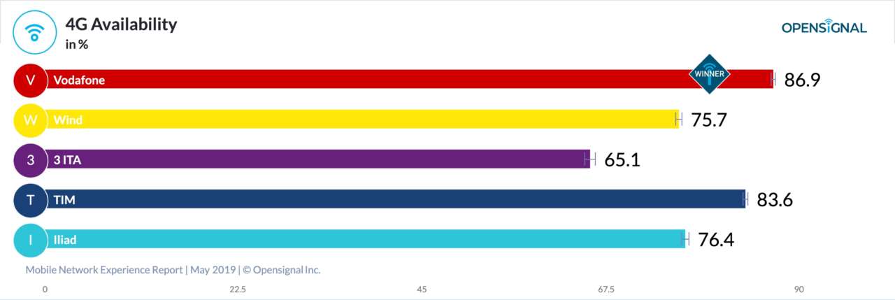 Vodafone si è aggiudicata il primato in 4G Availability, disponibilità 4G, aumentando il punteggio di poco meno di 5 punti percentuali dall’ultimo rapporto. Tuttavia Opensignal evidenzia come questo aumento sia stato in realtà il minore tra tutti e cinque gli operatori nazionali italiani, in base alle misurazioni. Sia 3 che Wind hanno aumentato i loro punteggi nella disponibilità 4G di quasi 7 punti percentuali. E il nuovo player Iliad ha mostrato l’incremento più ripido, di quasi 10 punti.