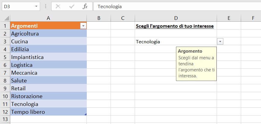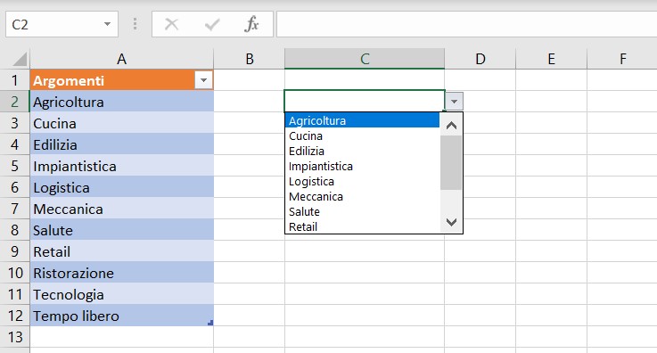 Seleziona ora la cella del foglio di lavoro in cui desideri che sia mostrato l’elenco a discesa dei valori consentiti per quella cella.