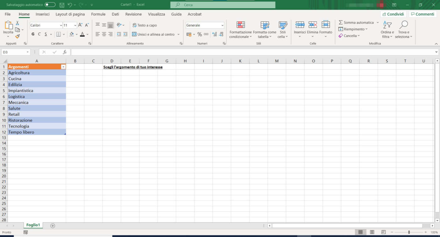Per prima cosa, inserisci in una colonna di un foglio Excel, uno per riga, le voci che andranno di seguito a popolare il menu a tendina che convaliderà l’input nella cella. Per un’esperienza d’uso migliore e più produttiva dell’elenco, è preferibile anche ordinare l’intervallo di valori.