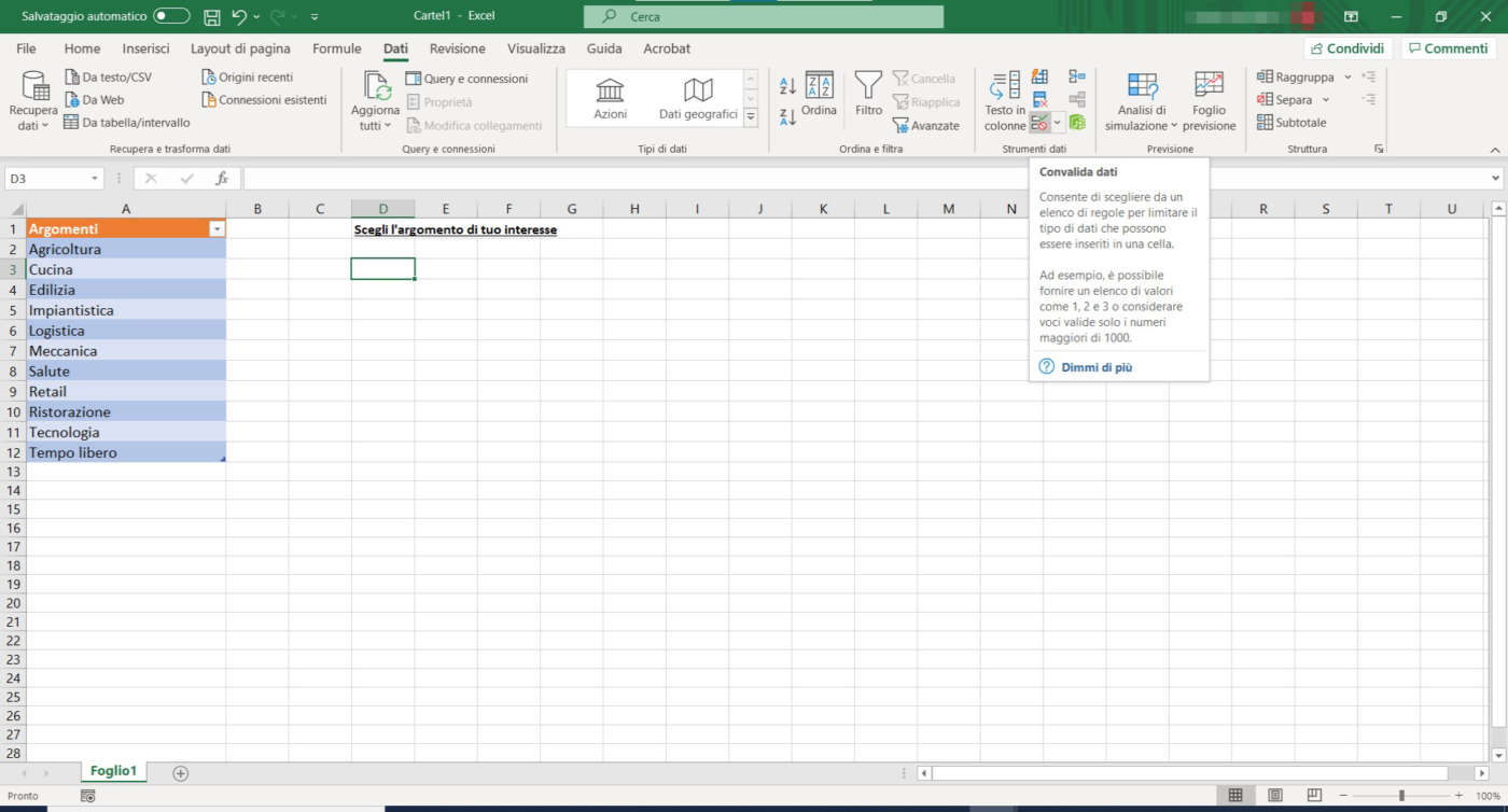 Con la cella target selezionata, attiva la scheda Dati della barra multifunzione e, nella sezione Strumenti dati, fai clic sul pulsante Convalida dati.