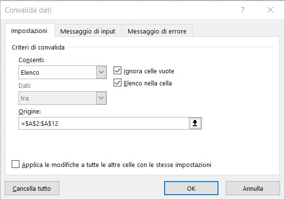 Sempre nel tab Impostazioni della finestra Convalida dati assicurati che siano attivate le opzioni Ignora celle vuote e Elenco nella cella.