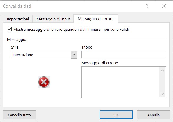In maniera analoga, regola le impostazioni della scheda Messaggio di errore in base alle tue esigenze.