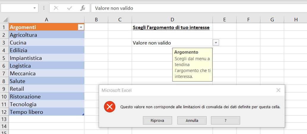 Ora, nell’utilizzo del foglio, quando selezioni la cella a cui hai applicato la convalida dati dall’elenco di valori, Excel mostra il messaggio di input, così come visualizza un messaggio di errore nel caso il valore inserito non rientri nell’elenco, se hai abilitato queste due opzioni.