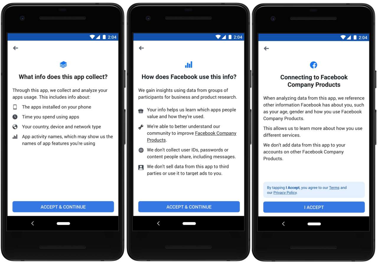 Attraverso il programma, la società di Zuckerberg raccoglierà e analizzerà informazioni tra cui: app installate sul telefono; quantità di tempo trascorso utilizzando tali app, Paese del partecipante, dispositivo e tipo di rete; nomi delle attività delle app.