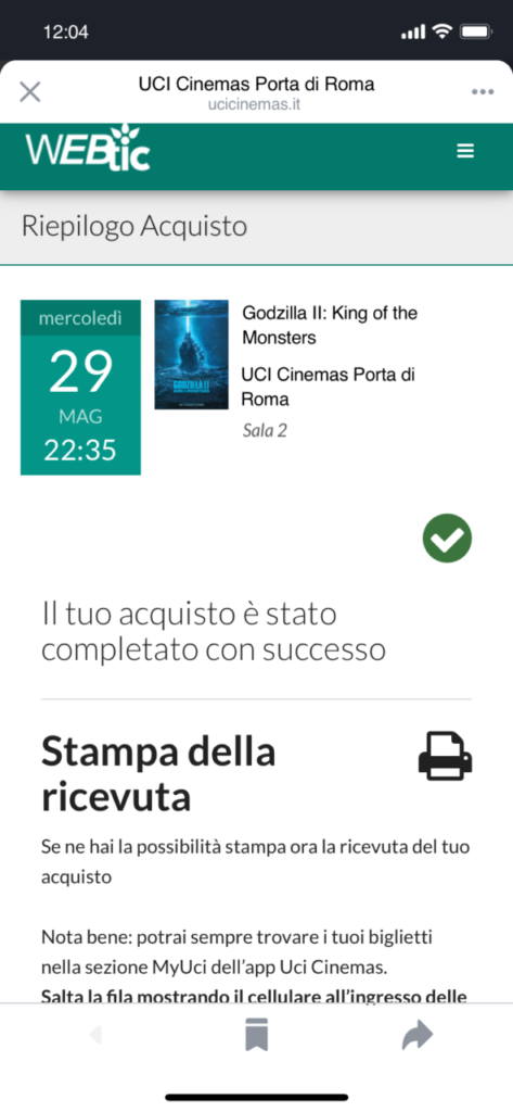 A fine procedura, il cinema invia all’acquirente una conferma via email con il codice a barre o il QR code del biglietto elettronico, a seconda di quanto previsto dal sistema di e-commerce utilizzato.