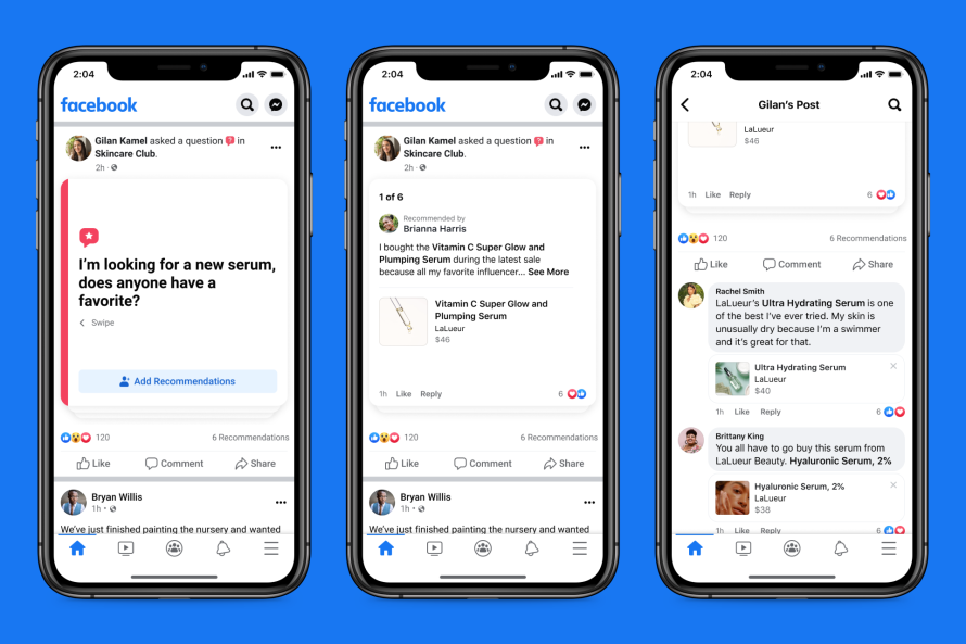Con la funzione Product Recommendations in Groups Facebook mostrerà i prodotti che i partecipanti suggeriscono quando si chiede un consiglio all’interno di un gruppo e renderà più facile l’acquisto di quei prodotti dai negozi su Facebook.