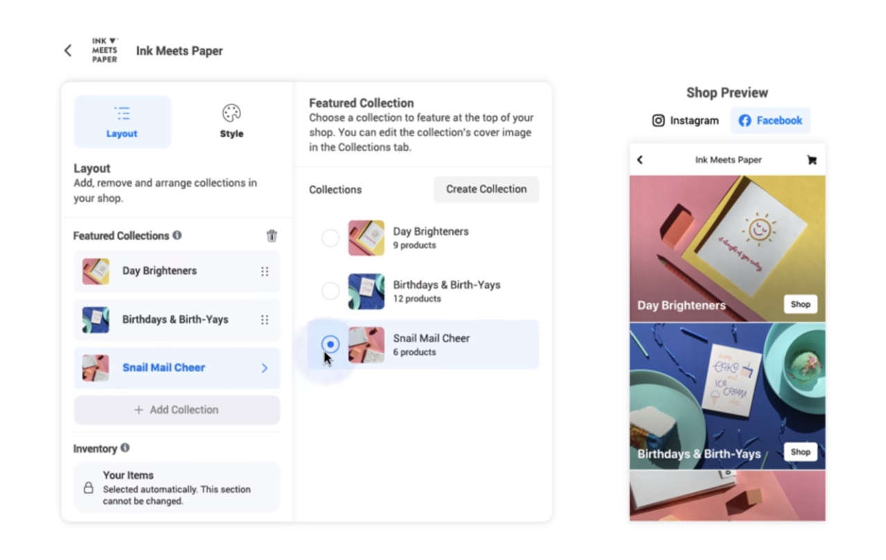I Facebook Shops sono stati pensati per aiutare le aziende a realizzare un unico negozio online, al quale i clienti possano accedere sia su Facebook sia su Instagram. La creazione di un Facebook Shop è semplice e gratuita. Le aziende possono scegliere i prodotti che vogliono inserire nel loro catalogo e, poi, personalizzare il look and feel del negozio con un’immagine di copertina e con colori che rimandano al proprio brand.