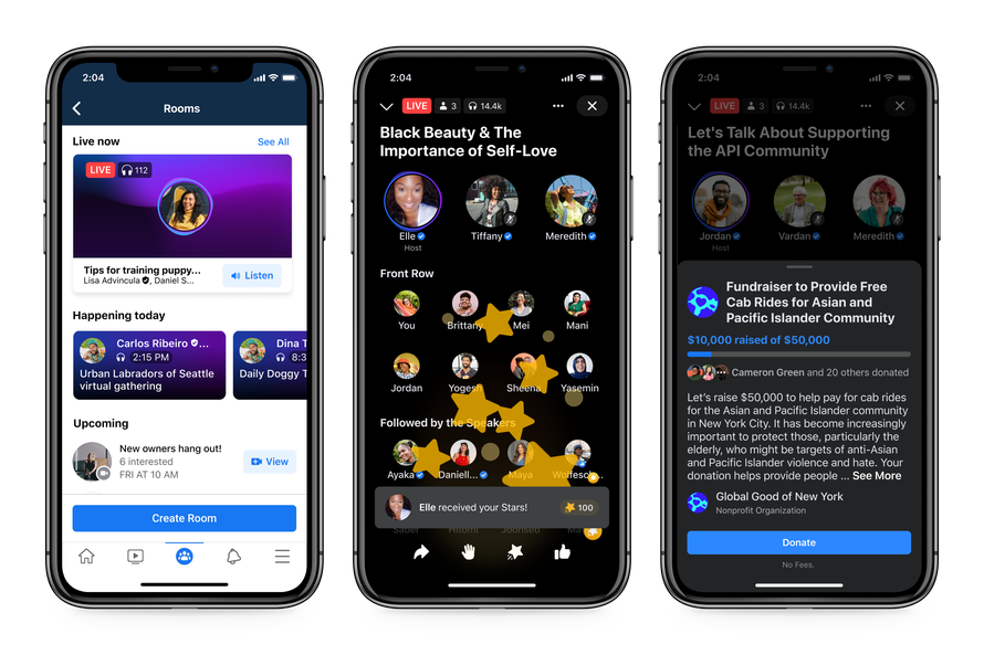 Come parte di questo lancio iniziale Facebook proporrà anche Live Audio Rooms con personaggi pubblici in modo che possano ospitare conversazioni con altri personaggi pubblici, esperti e fan.