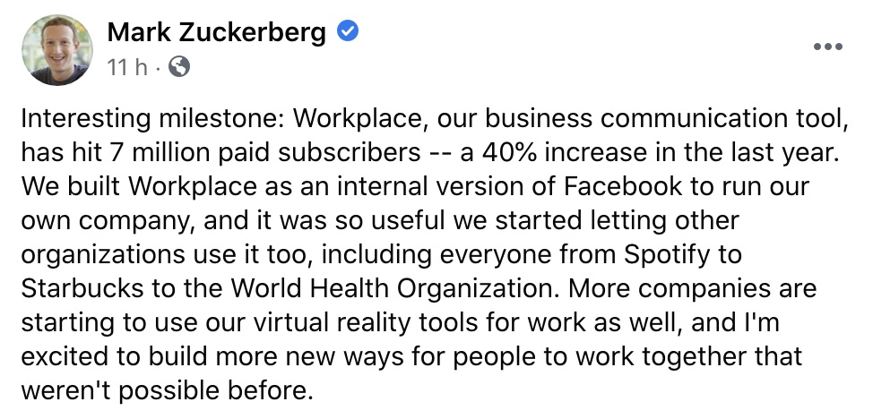 Come ha anticipato Mark Zuckerberg in un post pubblicato qualche ora fa, Facebook Workplace, lo strumento di comunicazione per connettere tutti i lavoratori di un’azienda, compresi quelli da remoto, ha raggiunto i 7 milioni di iscritti a pagamento.