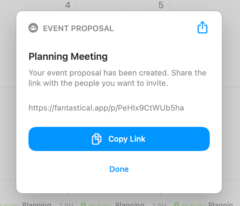 Con Fantastical 3.5, ora è possibile generare un URL per la propria proposta di evento e poi condividerlo manualmente con le persone usando il metodo che si preferisce.