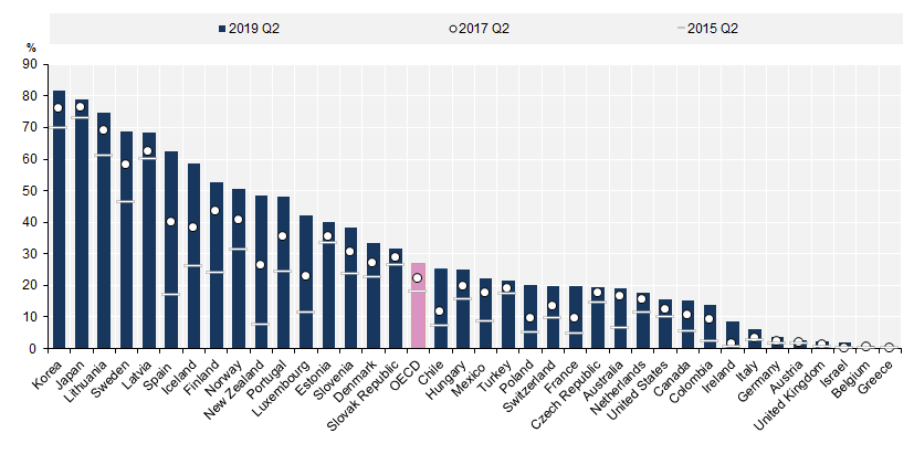 In tutti i 37 Paesi oggetti dello studio, prosegue l’analisi dell’OCSE, la percentuale di fibra nella banda larga totale è aumentata solo leggermente, passando al 27% al 30 giugno 2019, dal 24% di un anno prima. Questo trend riflette un divario ancora ampio tra i diversi Paesi nella diffusione della fibra, che abilita un’Internet molto più veloce.